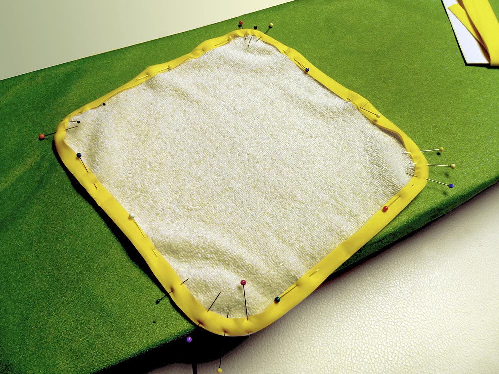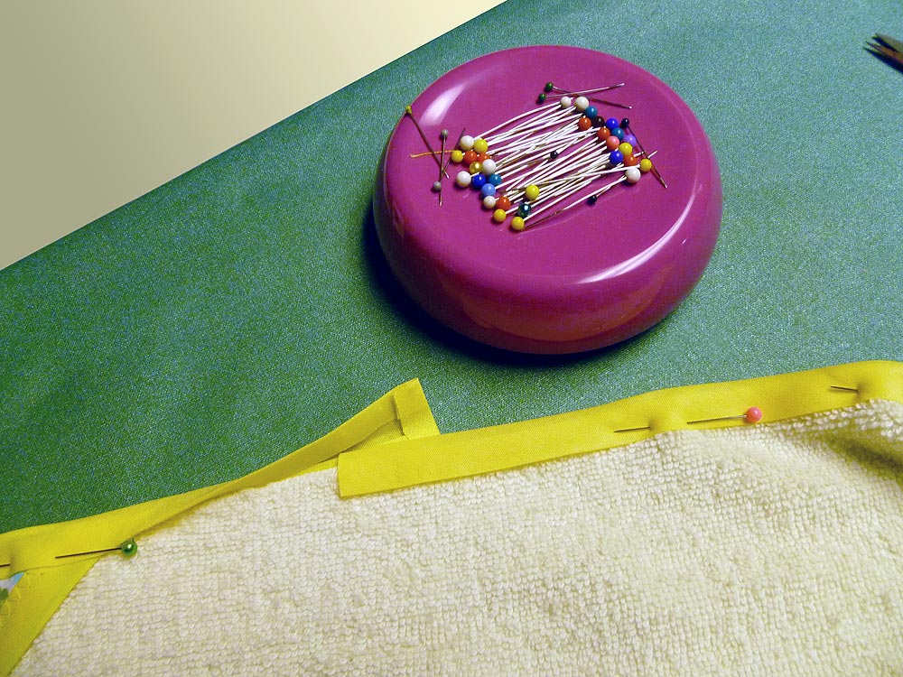 - Pin the binding around the entire outer edge of the towel. The terry cloth can be stretchy, so don’t be afraid to use plenty of pins – especially around the corners.