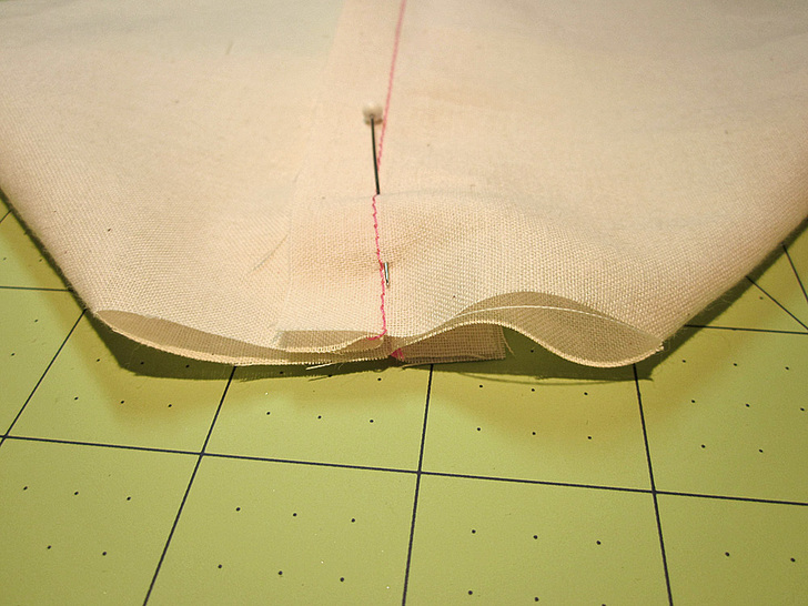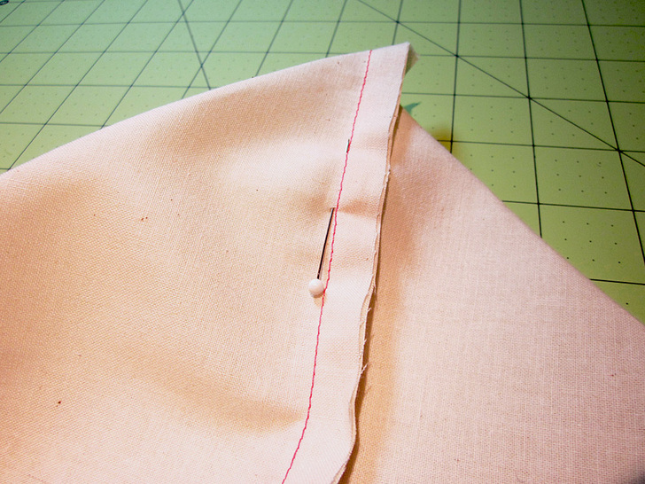 - With the sewn fabric still right sides together, use both hands to pinch and pull apart the corner. As you pull, the fabric will begin to form a little peak with the corner point at the top and the seam lines running down the middle of the front and the back. Align these side and bottom seams. The seam allowances should be facing in the same direction. Place a pin in the matched seams to hold them together. It is very important that you exactly match the seams; that is what will make the intersecting lines of your finished corner look good.