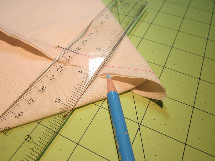 - Mark the depth of the boxed corner with a fabric marking pen or pencil and a straight ruler, positioning your ruler so the desired depth is measured from side to side at the base of the “peak.” Our desired boxed corner depth is 3” (more on how to determine measurements below). Slide the ruler down from the peak until you reach the point at which your “triangle” is the appropriate width (3″ in our sample). Draw a horizontal line at this measurement.