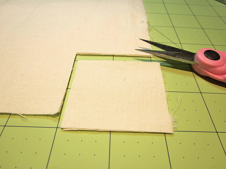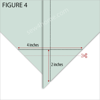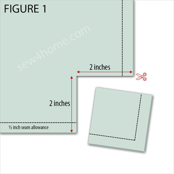- Measure, mark, and then cut squares of equal size from each corner. In our example, we wanted a 4″ finished corner and so cut out our corner squares at HALF that size or 2″ x 2″ squares (if you are using a pattern, you should be given your cut dimensions, but there are additional notes on measuring below).