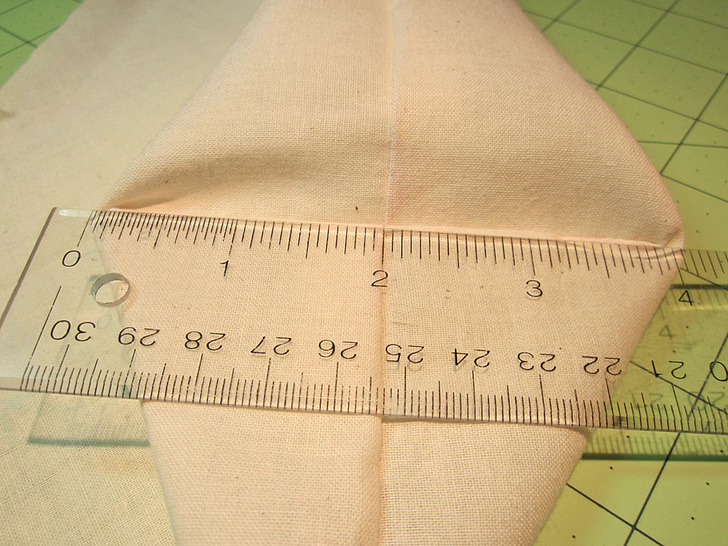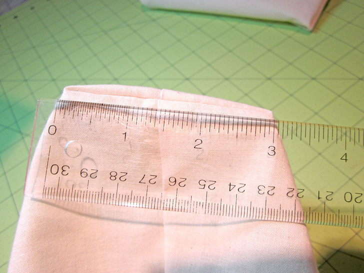 With a basic box corner, the distance from one folded edge to the other at the base of the peak is the depth of the box corner. Remember, in our example above, we sewed 3” across the peak from fold to fold, which yielded a 3″ box corner. Or from the top fold of the peak, you can measure HALF the width of what you want your finished corner to be.