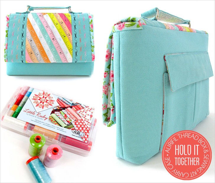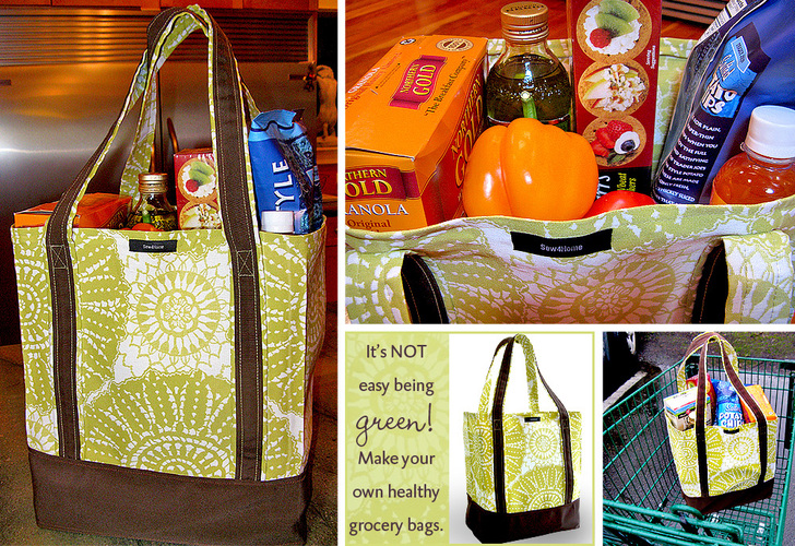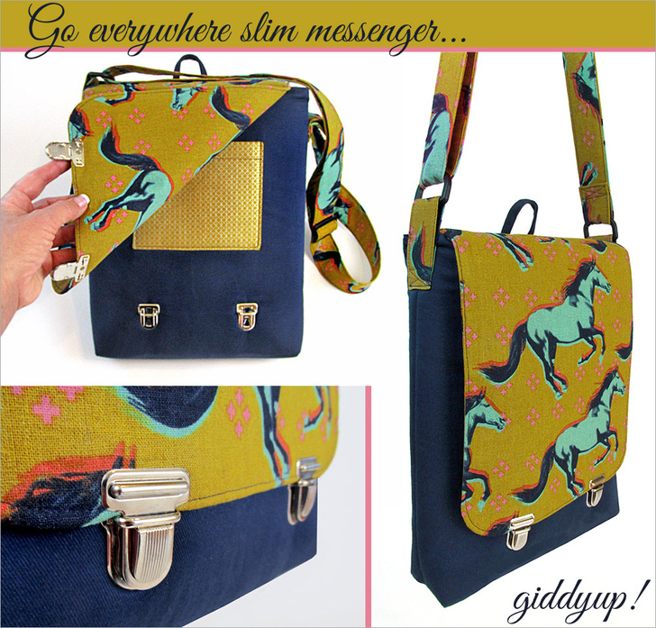 Projects shown in top image, clockwise from top right: Messenger Style Brief, Quintessential Plaid Tote, Back to School Totes, Big Canvas Beach Tote, Dritz Buckle Bag.
