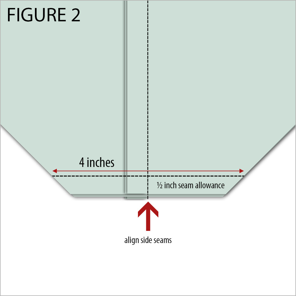 Don’t be fooled by your seam allowance when doing the calculations. The diagrams below show a cut-out corner that will result in a 4″ boxed corner. In figure 1, the side and bottom seams are both stitched with a ½” seam allowance and the corner box is cut out at 2″ x 2″. In figure 2, the corner is folded into place to yield the 4″ width when stitched across with a matching seam allowance (½”). “But, but, but,” you scream. “Where did that ½” go? The ½” seam allowance is accounted for because all three seams are a consistent ½” (side seam, bottom seam, and diagonal seam). A diagonal is always wider than an original square cut corner… that’s how it works. We love geometry, don’t we?