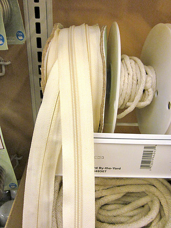 If you purchase zipper by the yard, you have to add the zipper slider/pull yourself on one end. The other end is usually sewn into a seam. This type of zipper is usually only available in basic colors, like black and white and sometimes a few primary colors. We used zipper by the yard in our Sleep Sack project as well as our Pyramid Bean Bag Chair.