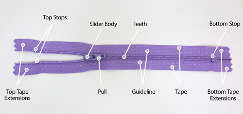Top and bottom tape extensions: The portions of the tape that extend beyond the top and bottom stops. These extensions give you space beyond the zipper to help secure it in place within your project.