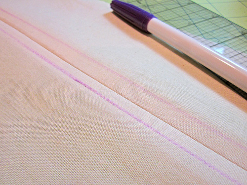 - On the right side, with a fabric marking pen, pencil, or chalk, draw a line ¼” from the seam on either side. This is going to be your stitching line.