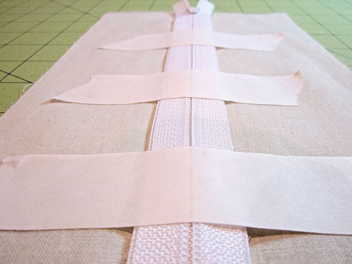 - On the wrong side of the fabric, interface the area where the zipper will be installed. The strip of interfacing should be slightly longer than your zipper, and the same or slightly wider than your seam allowance.