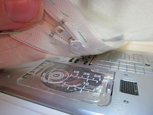 NOTE: If your machine has a knee lift, now is a great time to use it! You can also see why we recommended keeping the zipper pull in the up position earlier in the steps. It is now much easier to grasp and slide down and around the foot.