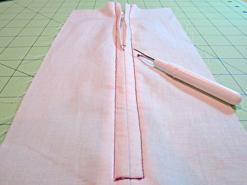- On the right side, use a seam ripper to remove the original basting stitches and expose the zipper.
