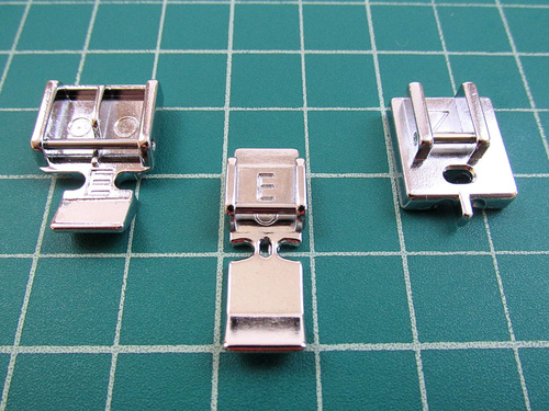 - Zipper foot E: This foot should come standard with your machine. To sew along either side of a zipper, you snap the foot on and off, switching sides of the foot as you sew (shown left above). It also comes in a 9mm version (shown center above) for those machines that can accommodate this width. This 9mm version of the foot is slightly elongated, and the left/right switch is accommodated by moving the needle position the machine.