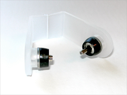 - Place a rubber tray into each hole at the tips of the Rivet Tool. This is done by inserting the tray’s post into the hole and pushing until you hear and feel it “click” into position. There is a smooth tray for the rivet stud cap and a dimpled tray for the rivet back.
