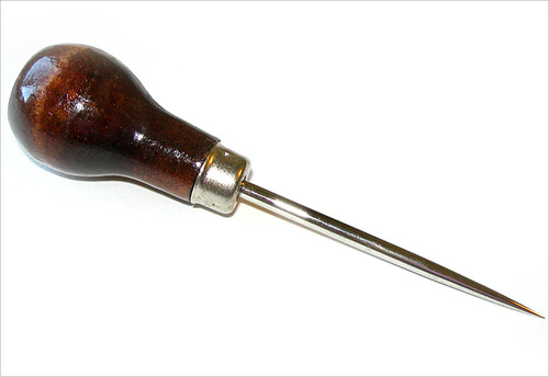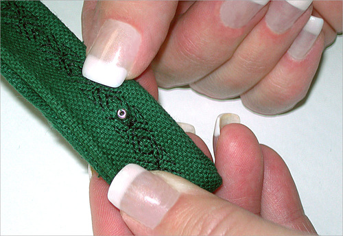 .An awl is also a good option when working with lighter-weight wovens. For these fabrics, you’ll get a much stronger rivet by carefully prying a hole between the threads of the fabric with an awl than by cutting the threads with the hole punch. The lighter the weight of the substrate and the smaller the hole (and the rivet), the more careful the cut. That said, if you still have trouble inserting the rivet, it’s okay to use a pair of small, sharp scissors to clean up and slightly enlarge the hole. This is true when using either a hole punch or an awl.