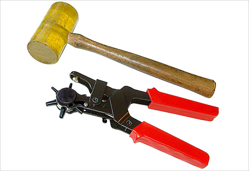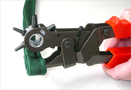 as well as locally at traditional hardware stores; Harbor Freight is one good option.A hole punch is a plier-like tool with a rotating wheel of variously sized sharpened, hollow spikes. Squeeze the plier, and the selected spike strikes against the opposing anvil. When your layers of fabric are in between the spike and the anvil, a clean hole is cut.