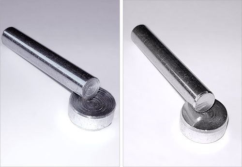 Much like how a snap is applied, you need to press together two pieces to create a finished rivet. Due to the thickness and quantity of layers with which you are usually working, this can take quite a bit of pressure. You need an anvil to help support the base of the rivet and a setting post to hold the top of the rivet in place and on which to strike your hammer. These tools are machined with one side concave (on the left above) and one side flat (on the right above). This allows you to match the surfaces of the anvil and post to the surfaces of your rivet pieces. Many rivet sets come with an appropriate post and anvil tool.
