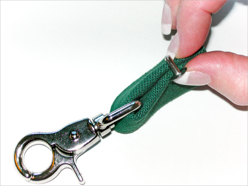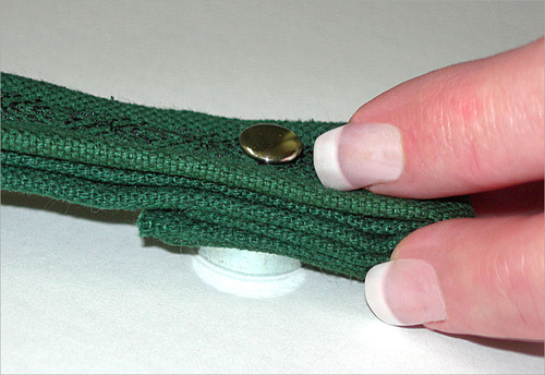 - Rotate the strap so the Rivet Tool is sitting flat on your work surface and the top of the stud is visible coming through the back layer of the strap. Slip the black padded disk that comes with the kit under the Rivet Tool. This helps cushion the tool and protect your work surface.