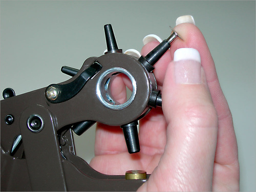 - Test the post of your selected rivet in the hollow spikes of the hole punch. You want the smallest hole into which the rivet post will slide. If it won’t slide in, that hole is too small. If it slides in and swims around, that hole to too big. Pick the hole that is just right.