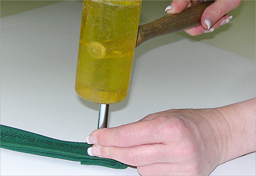 NOTE: The Dritz® Rivet Tool Kit does include a hole cutting tool. Remove one of the rubber trays and insert the cutting tool, which looks like a small post. Insert so the tapered end of the post is facing down. Place the padded disc under your marked point and, holding the Rivet Tool flat, position the cutting tool against the fabric at the marked point. Strike with a hammer to pierce the fabric. This is certainly an option should you not have a separate hole cutter.