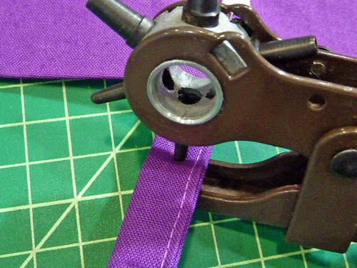 We have had very good luck with the hole punch on a variety of the heavier wovens into which rivets are placed as well as in faux and real leathers. However, If you can’t find or don’t wish to purchase a heavy-duty hole punch, you can make holes using a sewing awl