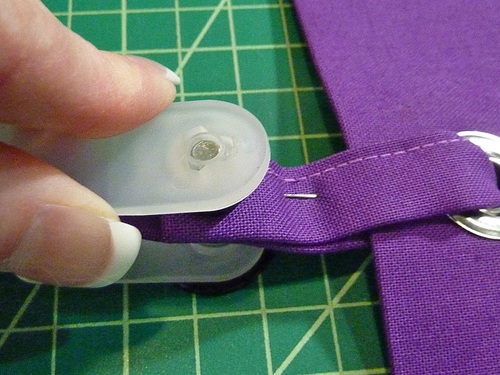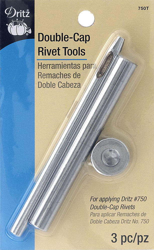 that allows you to place a rivet back/post in one cup and a rivet cap in an opposing cup. You can find and purchase the tool by itself, but are more likely to find it in a kit with rivets. The layers of fabric go in between, against the tool’s hinge, then you gently hammer cap to post. We show more detailed steps below.The Dritz® Double Cap Rivets (described below and a Sew4Home favorite) use the more traditional setting post and anvil for application, and also comes with a matching cutting tool (shown above).