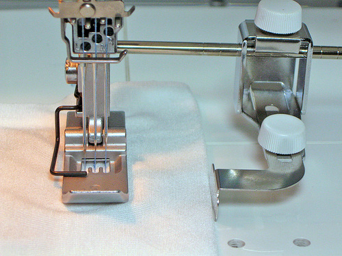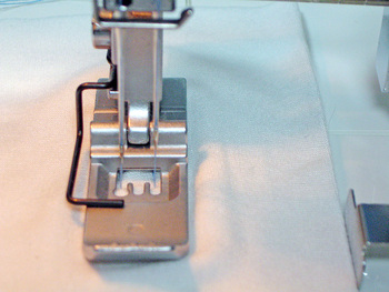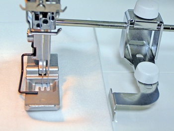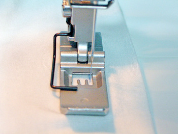 Press the hem in place and, if possible, use a seam guide. An adjustable seam guide is usually an optional accessory (the Janome CoverPro Seam Guide is pictured below), but it does offer that extra bit of precision.