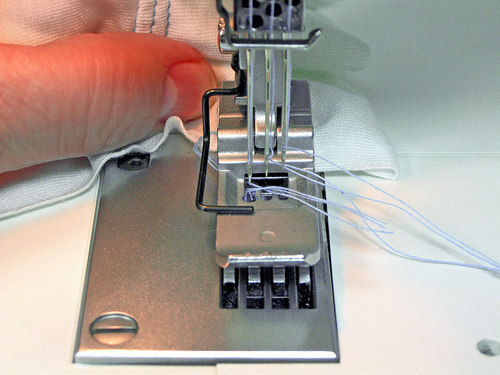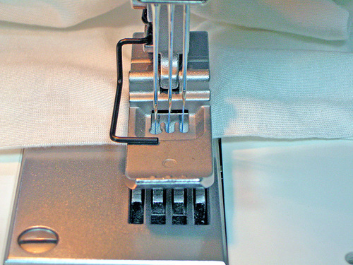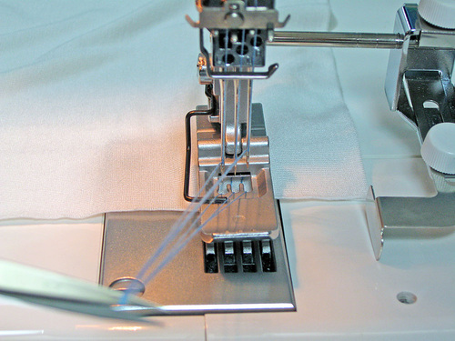- Stop sewing at the end of the fabric. Do not attempt to sew off the fabric to create a chain as you might do with a standard serger; the threads will break and tangle requiring you to re-thread.