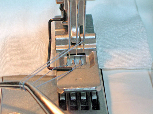 - Once the needles are threaded, turn the hand wheel a full rotation towards you, and slide the tip of your tweezers (yep, sergers always come with tweezers) under the presser foot to pull the needle threads under the foot.