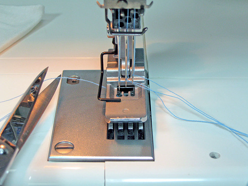 - Lift the presser foot, and use the tip of the tweezers to pull the needle threads toward you about 4″.