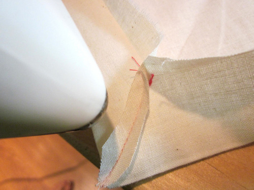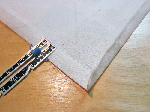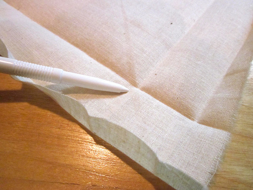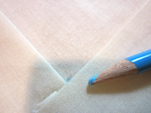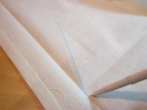 - With a fabric pen or pencil, mark the point where the inside edges of the two hems meet.