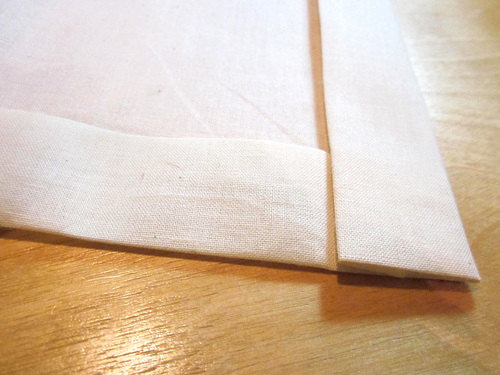 - Fold and press the side hem again, this time by 1”. Then, fold and press the bottom (or next side) hem again, this time by 1”. As above, the hems will overlap at the corner. Press well during both steps to set visible crease lines.