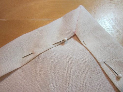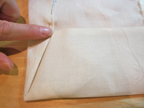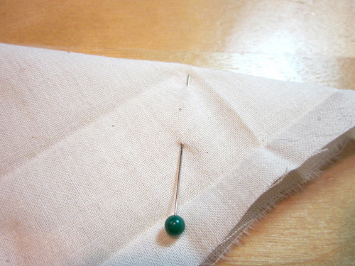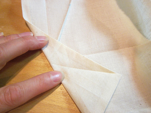 NOTE: As we mentioned above, you may have to fuss with this fold, and do it more than once, to get the angle just right. - Starting at the side hem, fold in the fabric at an angle to meet at the marked point. Pin in place. Again, you may have to try this a few times to get the fold just right.