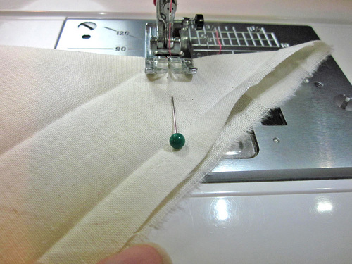 - Using a straight stitch, sew from the the pin point at the folded edge to the first pressed line. Remove the pin as the stitching starts.