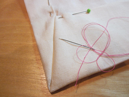 - Flip the corner right side out, and following the previously pressed guidelines, fold the hems back into place, pushing out the corner hem. Pin the folded edges.