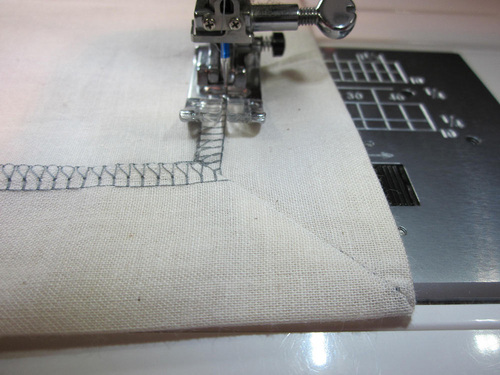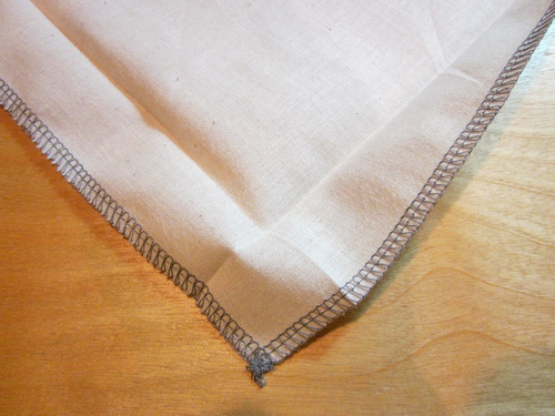 In our examples above, we opted to turn under the raw edges of the fabric along the hems. However, instead of that first fold, you could finish the raw edges of your fabric first, before creating the corner hem, using a zigzag stitch on your sewing machine or an overlock stitch on your serger. Our photo shows a serged edge.