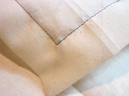 NOTE: As mentioned, we are using a light fabric and contrasting thread to insure you can see and follow along with our steps. In real life, you’d use matching thread for your fabric to stitch the miter closed.