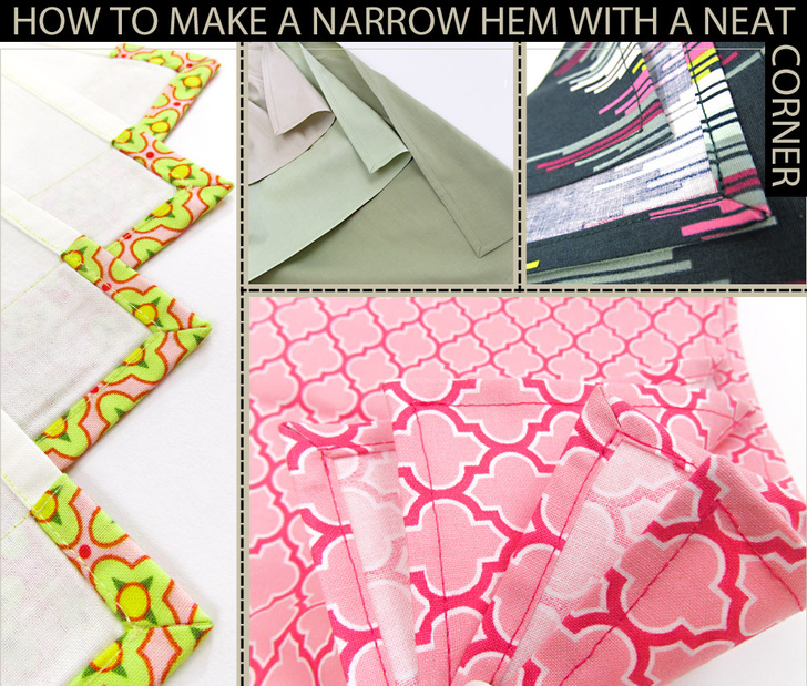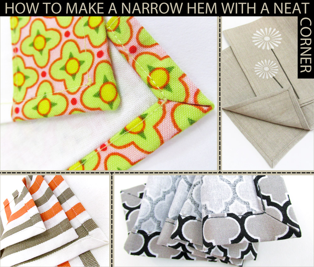 Below are the steps a ¼” double-turn hem. This sample is a simple napkin project, but you can use the technique anytime you need a narrow hemmed corner. We love it for single-layer apron skirt corners, placemats, even lightweight blankets.