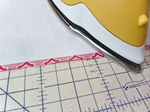 Along all edges, fold back the raw edge ¼” and press well. We’re using the Clover Hot Hemmer, which is always handy for pressing small hems.