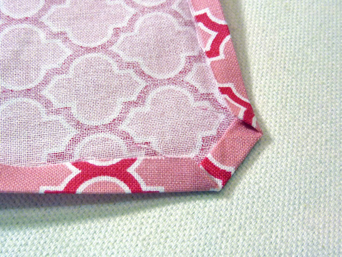 With this wider hem, we often suggest cutting off the point of the first corner fold to reduce bulk. To do this, fold in the point of the corner as above and press.