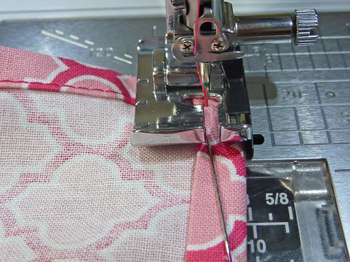 Make a sharp pivot at each corner, which means you will stitch into the exact corner, stop with your needle in the down position, raise the presser foot and turn the fabric 90˚ so it is positioned correctly to stitch the next side.