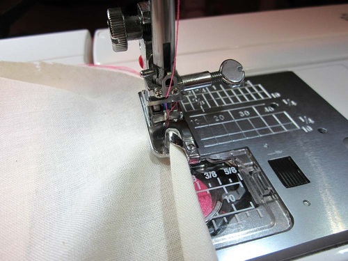 - Begin to sew, continuing to hold the fabric taut, but not too tight, allowing it to easily feed into the foot.