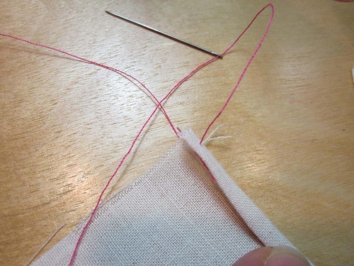 Another method to help start fabric at a corner is to use a hand sewing needle and approximately 10” of thread.
