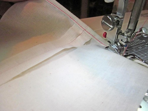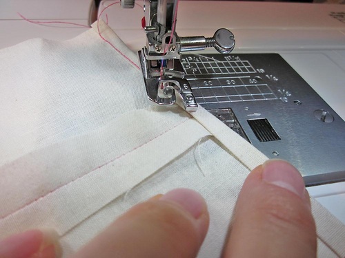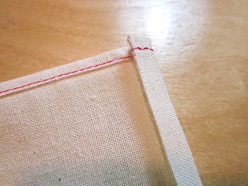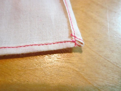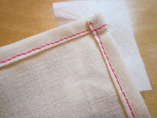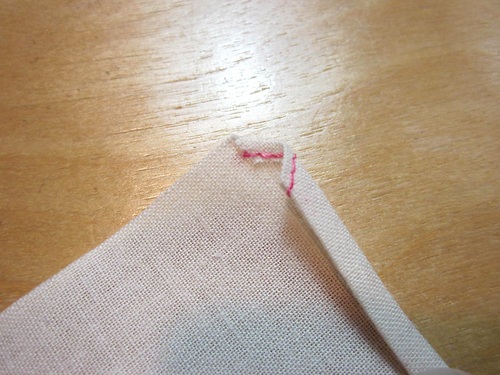 NOTE: Depending on the fabric type, especially for a bit thicker fabric, you may need to add a few hand tacking stitches at the corner where you can’t quite catch the corners evenly.