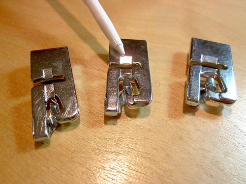 You can get an idea of the width of the rolled hem you will achieve with each foot by looking at the underside. The channel under each foot allows the rolled hem to easily flow out the back of the foot.