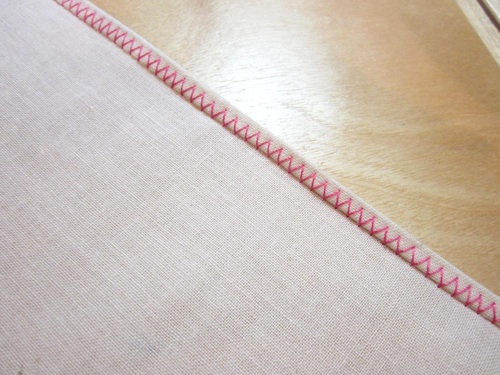 Prepare your fabric and set up your sewing machine the same as for a basic rolled hem, but instead of selecting a straight stitch, select a zig zag stitch. Your finished rolled hem will look like this.