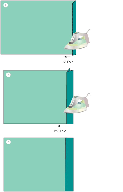 Let’s say you have 2″ to work with for the bottom of a curtain. First, fold in your raw edge ¾” and press. Then, make another fold 1¼”. Your first fold rolls inside the second and you end up with a nice folded edge on both the top and bottom. Press this double fold and stitch down, sewing close to the fold in the fabric.