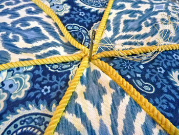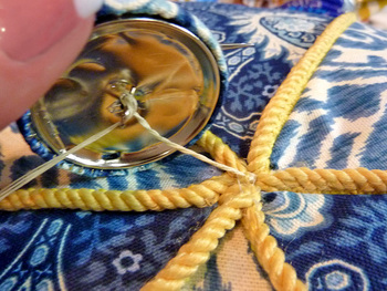 Once you have your covered buttons finished, you need to sew them on. Again, the shank on the kit’s button back is standard and may seem small when you’re trying to stitch it onto your pillow front. Don’t despair! A good trick is to get your needle and thread going first. Make a few stitches right where you want the button to go to get your knot situated and your stitching secure, then continue stitching through the shank.