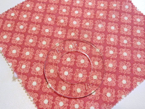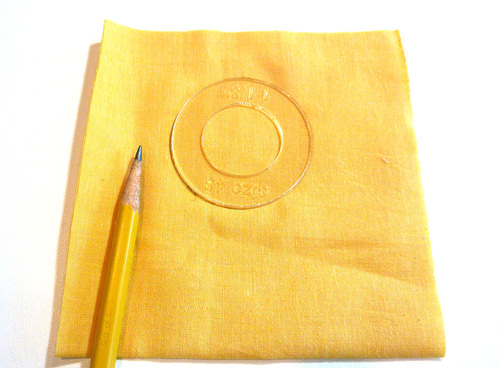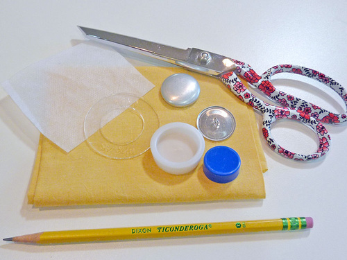 You’ll need your fabric, and we also recommend a small square of lightweight fusible interfacing as a fabric backing – especially if you’re using a quilting weight cotton or similar. This insures you won’t see through the fabric to the metal cover beneath; it also gives the button an extra-smooth finish. Finally, you need a pencil to trace your circles and scissors to cut them out.