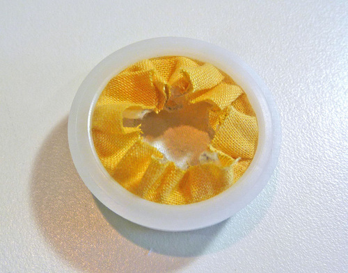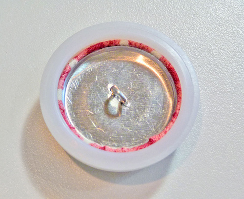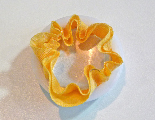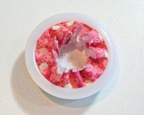 - Using your fingers, gently push the button shell down into the mold. The fabric should gather up around the button shell like a little pouch.