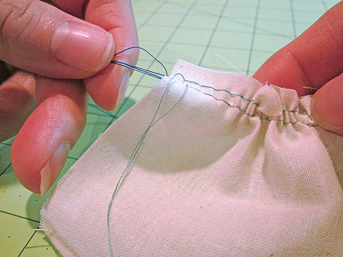 - When you’ve achieved the finished length needed, knot the thread tails at the ends to hold the gathers in place. Otherwise, your gathers have the potential to simply stretch back out again!