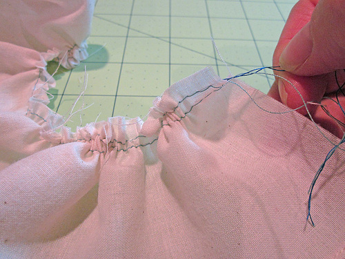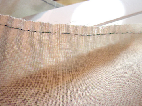 - Holding the (bobbin) thread tails firmly, begin to gather the fabric from one side toward the center of the fabric. Your fabric will slide along these threads like a curtain on a curtain rod, forming gathers/ruffles.