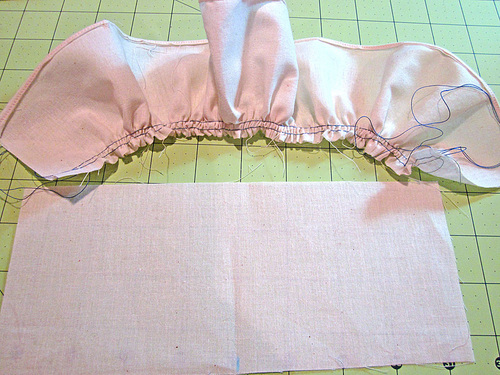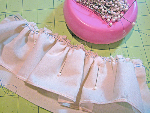 If you forgot to mark your center and side points before you started, pin the basted strip to the straight edge at the center and/or the side edges (just these points – don’t fill in with pins). Then, gather between the pin points to the finished size.